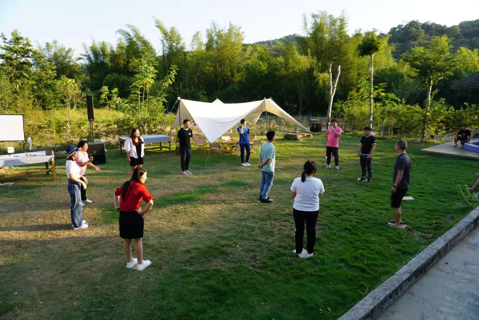 At about 4:00 pm., we arrived at the Nankunshan Hot Spring Resort in Huizhou City. After getting off the bus, we unloaded the SR audio equipment we had brought from afar, the game props we had taken great efforts to purchase, and the rich barbecue ingredients we had carefully selected, and headed to the long-awaited hot spring Resort.